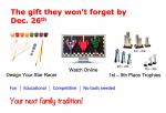 Boy or girl, fast or slow, athletic or not, all children have a competitive spirit inside of them.Star Racers celebrates that spirit with an online model race held shortly after Christmas. We have wonderful trophies for 1st through 9th place finishers.But we are not just about competition and trophies.Painting a Star Racer is fun: messy or sleek, children can come up with some incredibly creative designs.And of course, there is the excited anticipation of race day approaching: this is not a holiday gift that will be forgotten by December 26th!And remember, they cannot win if they do not race, so order them a Star Racer today.We hope it will be the start of a new family tradition.